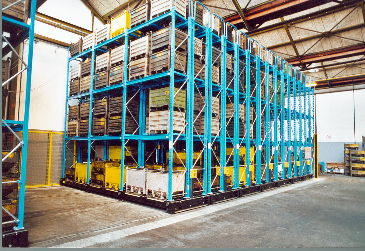 A hagyományos állványrendszereket mozgó alvázra szerelik, amelyek görgők segítségével tolhatók össze. A be- és kitároláshoz szükséges folyosót távirányítással vezérelt meghajtás nyitja meg.