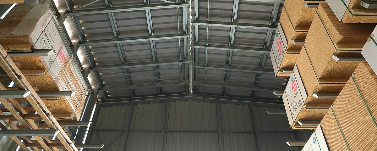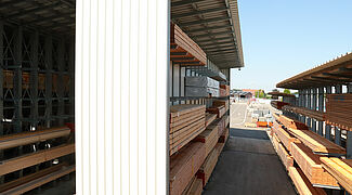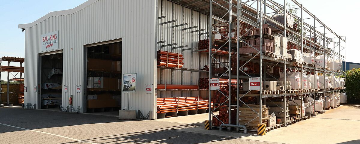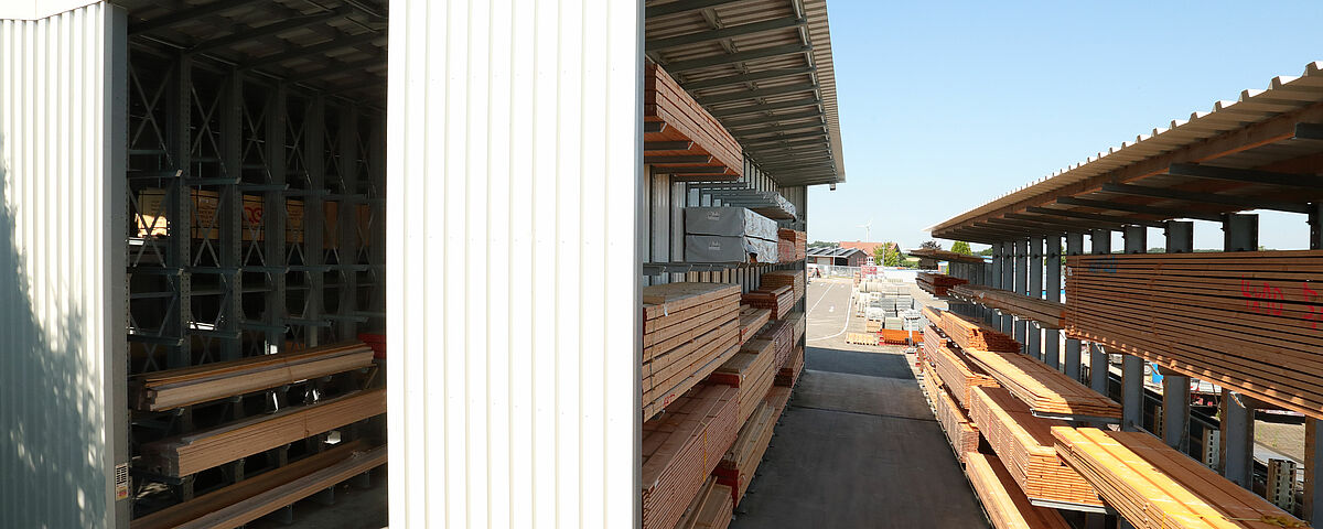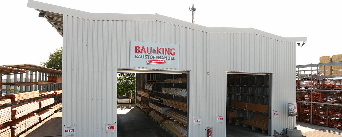 A BAUKING két telephely összevonásának keretein belül átalakította a faipari termékek tárolását is a lorupi székhelyén. Az új, karos állványokból épített OHRA állványcsarnokban az ügyfelek mostantól központi helyen találják meg az építőanyag-kereskedő vállalat minden faipari termékét. Az állványrendszer jelentősen nagyobb tárolási kapacitást is biztosít, így a BAUKING több különböző terméket tud tárolni. A kültéri tárolóterület biztonságos vízelvezetése érdekében a csarnok padlólemezének két irányban 0,7 százalékos lejtése van. Ezt a meredekséget az OHRA úgy kompenzálta, hogy a karos állványokat egy szűk rácsba és egy speciális, rugalmas tetőszerkezetbe rögzítette.