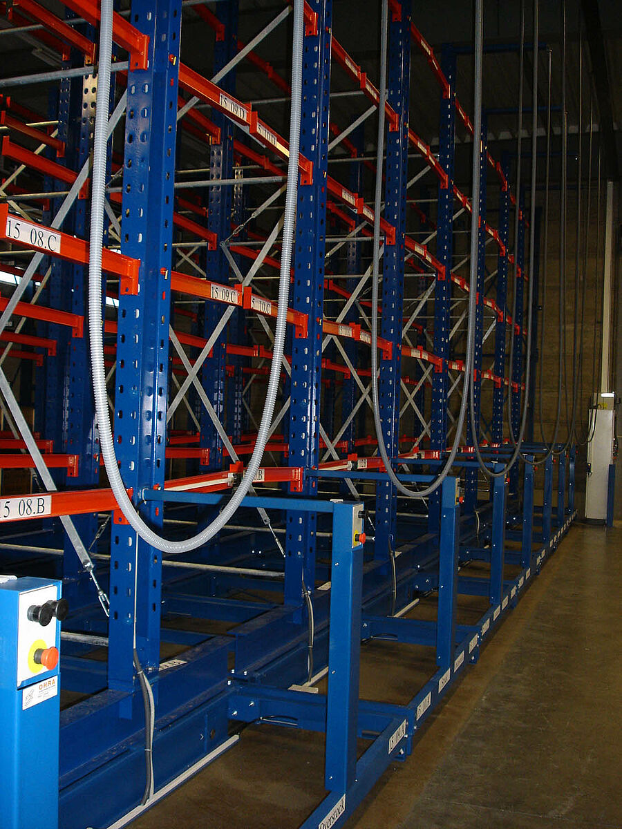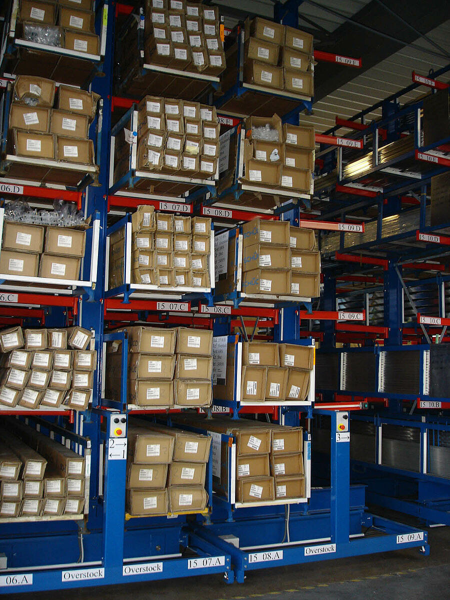 Az ügyféllel együttműködve kidolgoztuk a termékek racionális raktározásának különböző lehetőségeit. Az optimális megoldás lehetőségét a szállítókocsis karos állványok jelentették. Ezzel a tárolási móddal lehetővé vált a csekély alapterületen történő nagy tömegű áru tárolása. A polcsorok között lévő járatok úgy kerültek megtervezésre, hogy a berendezéstől oldalra álló falipolcok frontálisan használhatóak legyenek. Ez statikailag szerelt polcok esetén nem lett volna lehetséges.