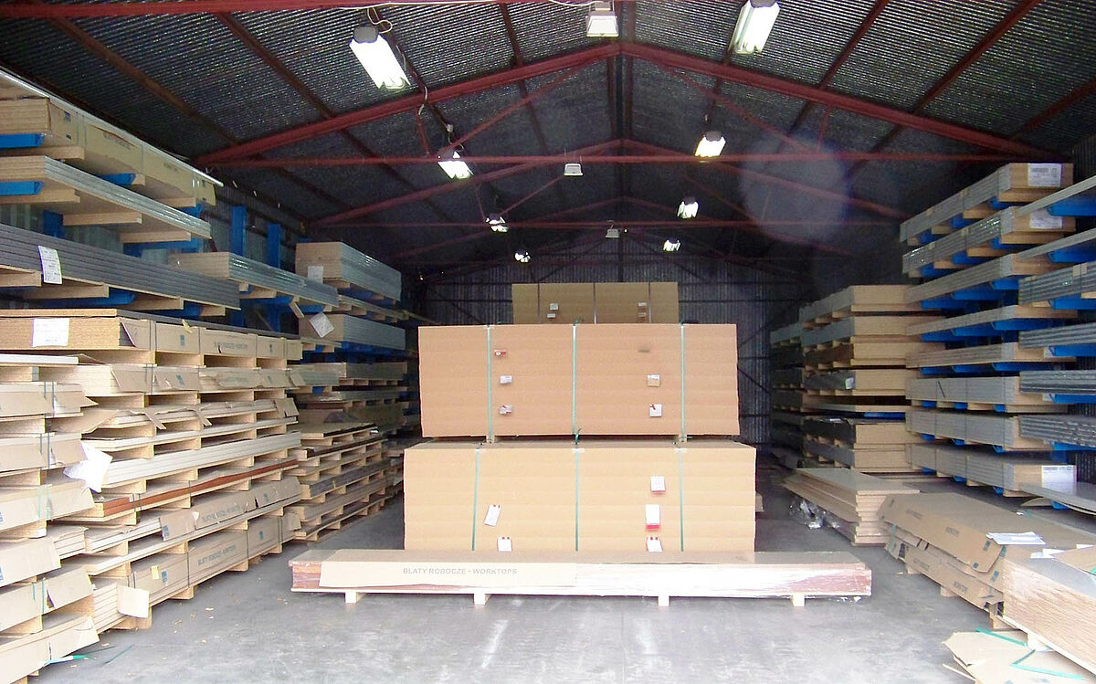 A rakfelület tökéletes kihasználása céljából a lengyelországi Damar vállalat raktárát OHRA konzolos és raklapos polcokkal szerelte fel. A polcrendszerek nem csak a forgács-, OSB- és konyhai munkalapok átlátható tárolását teszik lehetővé, hanem rugalmasan konfigurálhatóak is - hozzáigazíthatóak a változó raktározási adottságokhoz, egyedileg alakíthatók az épület helyzetének megfelelően.