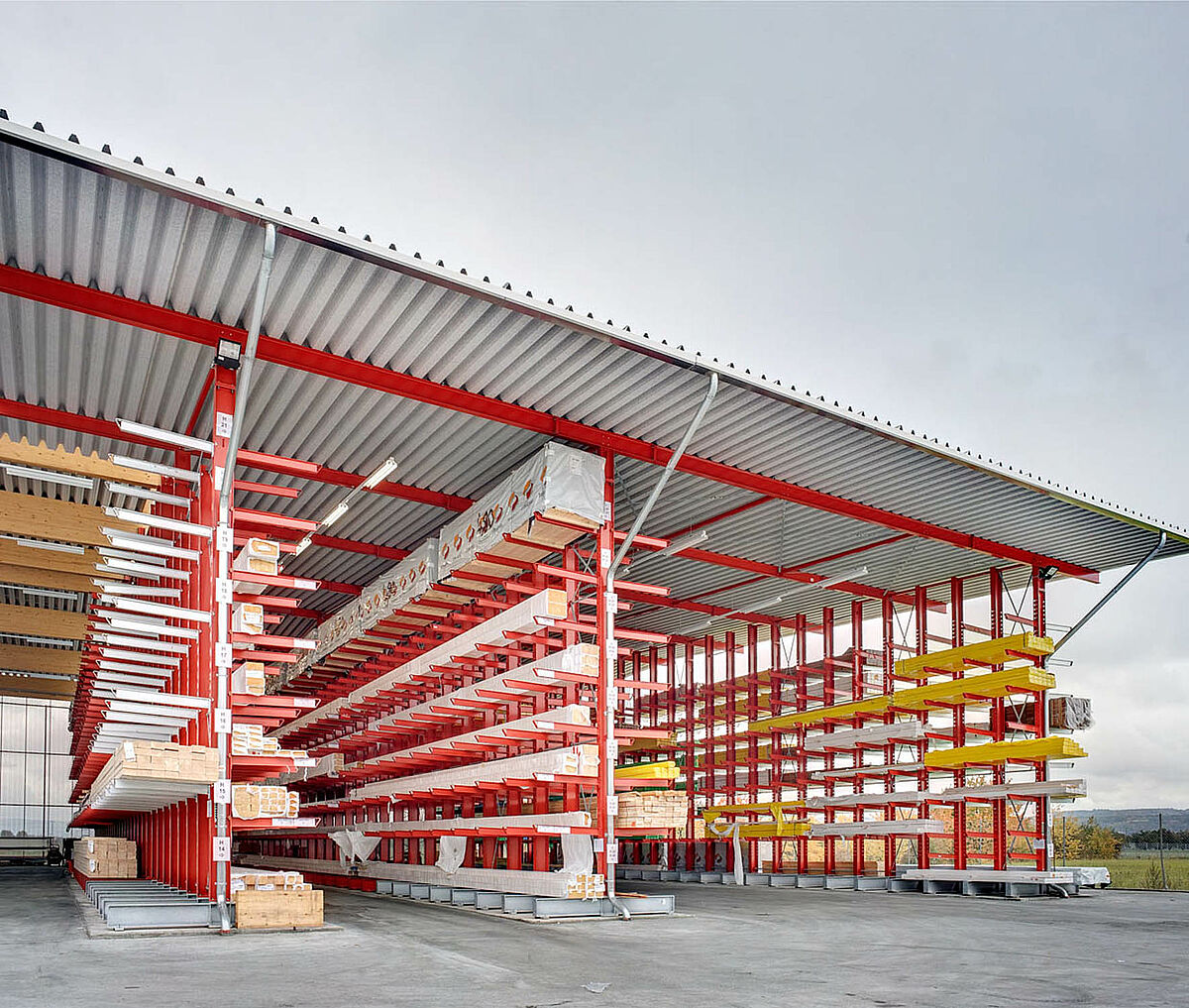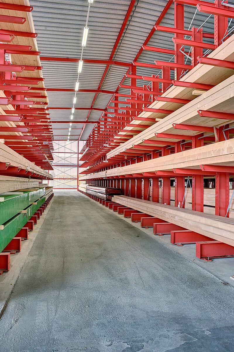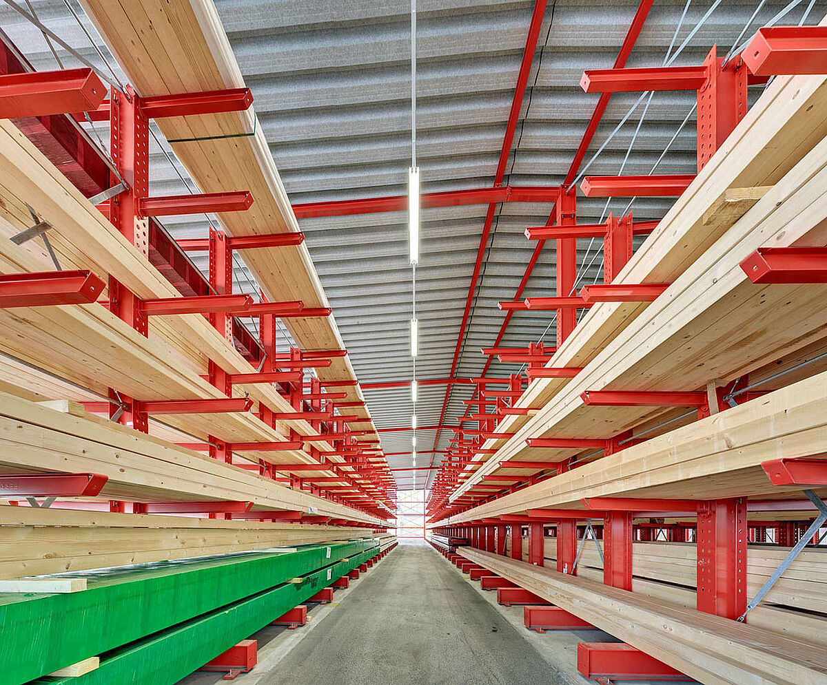 A kétoldalú karos állványok legmagasabb pontja 8.600 mm és polcoldalanként 6 raksíkkal rendelkezik. Konzolonként 800 kg terhelhetőség mellett így pl. egy 33 állvánnyal rendelkező polcsorban 26,4 t anyag összsúly helyezhető el egy raksíkon. Az új faraktár által igénybe vett összterület kb. 3.100 m2. Az orommagasság 9.750 mm. Ennek során figyelembe kell venni, hogy az acélból és enyvezett gerendából álló tetőszerkezetet az ügyfél választotta. A fesztávolság kb. 21.000 mm. A saját teljesítésekkel itt az ügyfél a kivitelezés során pénzt takarított meg.