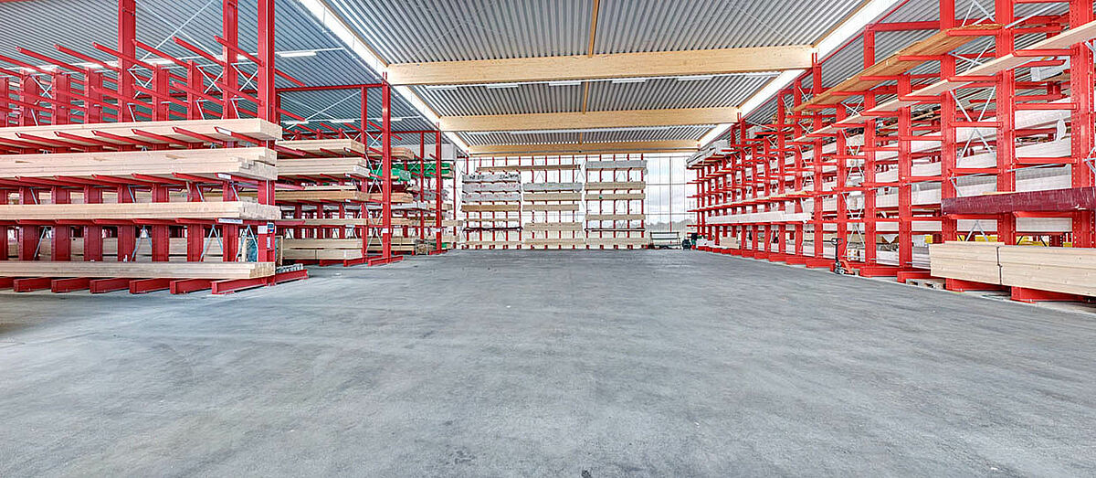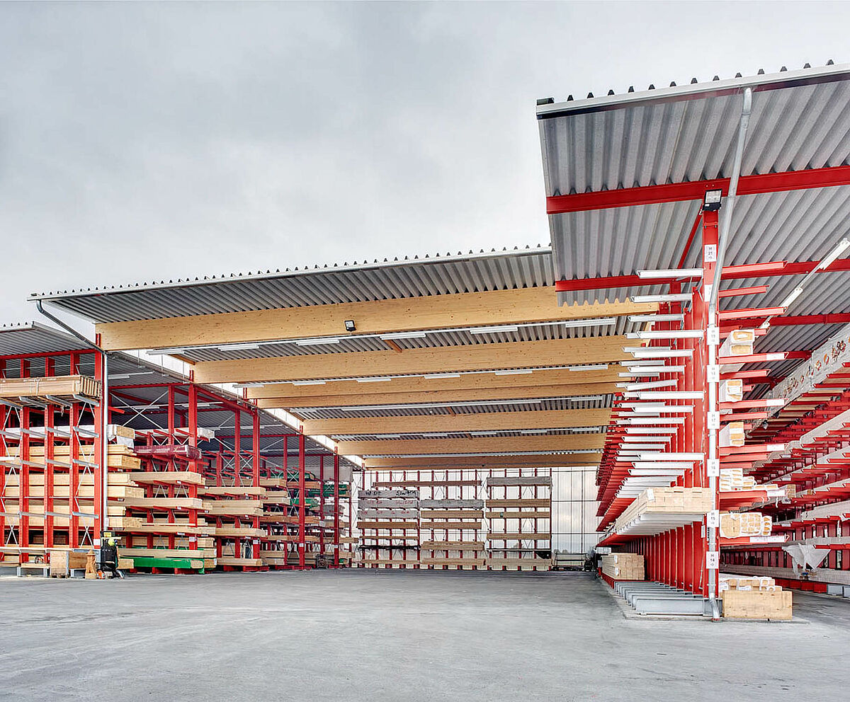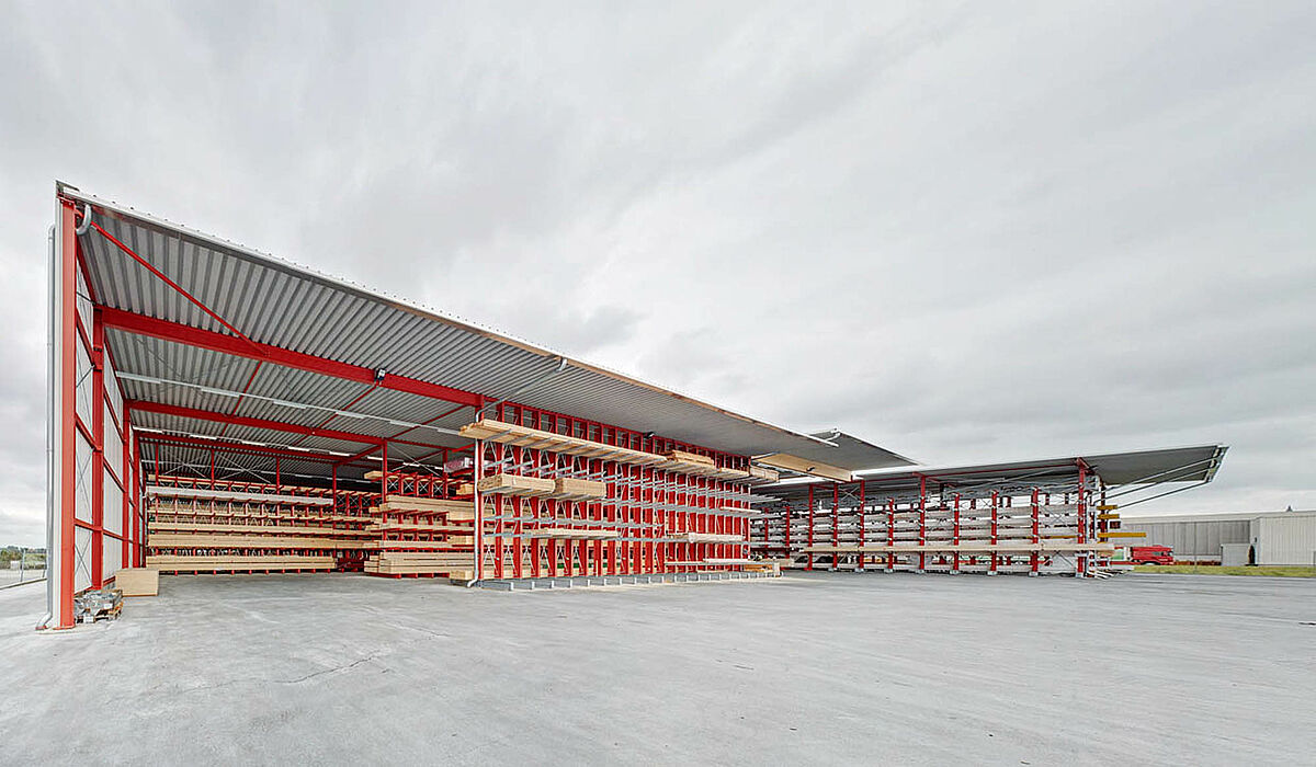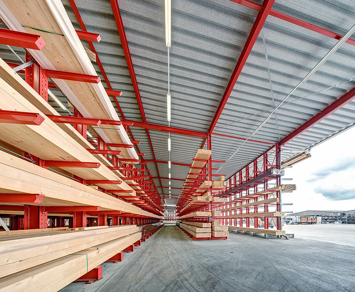 A kétoldalú karos állványok legmagasabb pontja 8.600 mm és polcoldalanként 6 raksíkkal rendelkezik. Konzolonként 800 kg terhelhetőség mellett így pl. egy 33 állvánnyal rendelkező polcsorban 26,4 t anyag összsúly helyezhető el egy raksíkon. Az új faraktár által igénybe vett összterület kb. 3.100 m2. Az orommagasság 9.750 mm. Ennek során figyelembe kell venni, hogy az acélból és enyvezett gerendából álló tetőszerkezetet az ügyfél választotta. A fesztávolság kb. 21.000 mm. A saját teljesítésekkel itt az ügyfél a kivitelezés során pénzt takarított meg.