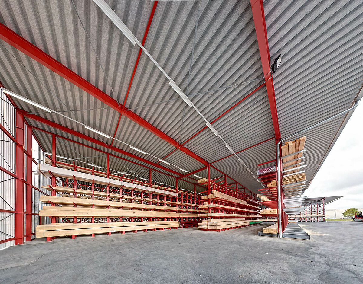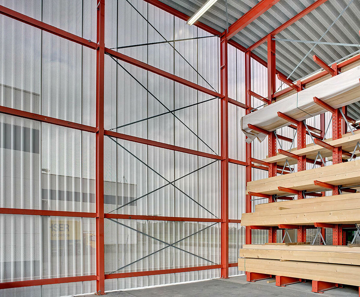 Magától értetődő, hogy a teljes acélszerkezetet az ügyfél kívánságára házának színével (RAL 3000) vontuk be. A karos állványok lábainak egy részét tűzi horganyzott kivitelben szállítottuk, hogy heves esőzések során se legyen esélye a rozsdának. Végül a polcrendszer oldal- és hátfala lyukasztott trapézlemez borítást kapott. A speciális lyukasztásnak köszönhetően a lemez egyrészt eső- és szélbiztos, másrészt átengedi a fényt és lélegzik.
