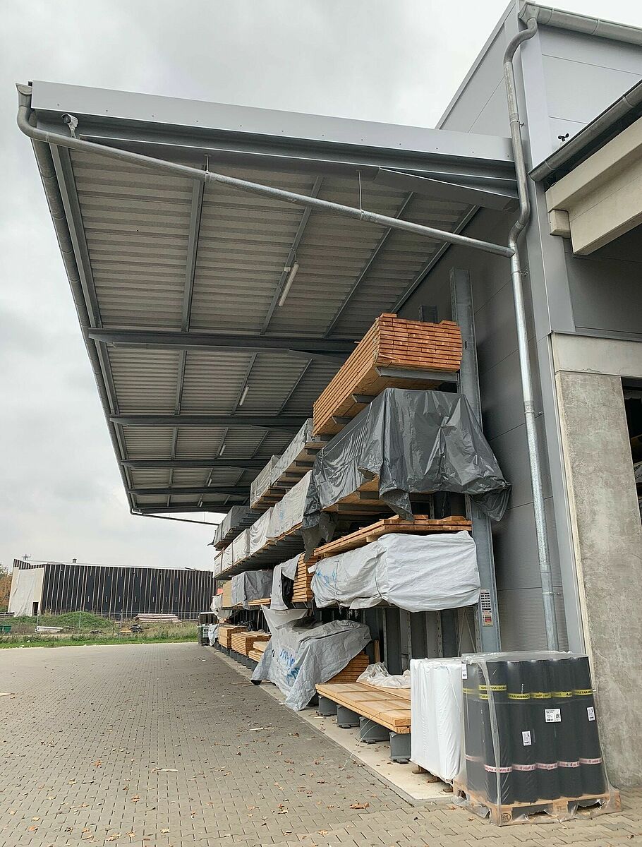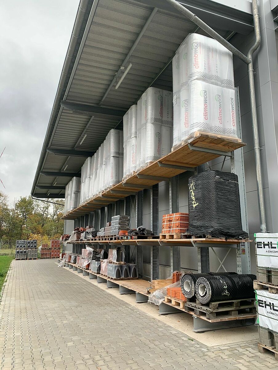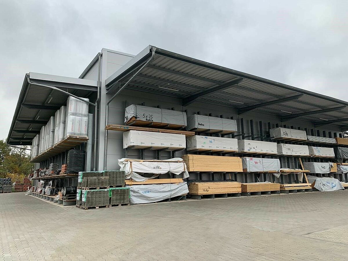 Az újonnan épített, 12 méter magas raktárcsarnok 1000 négyzetméteres területen olyan új termékeknek nyújt helyett, mint a homlokzati panelek, hőszigetelő panelek vagy szerkezeti faanyagok. Az anyagok jelentős részét korábban kültérben vagy földön tárolták, most pedig kényelmesen és védetten az állványokon helyezik el. A 6,58 méter magas raklapos állványok és 7 méter magas karos állványok segítségével egyrészt sikerült a raktárkapacitást bővíteni, másrészt pedig az árukhoz való hozzáférés is lényegesen javult. Az OHRA összesen négy, kb. 18 méter hosszú, raklapos és karos állványokból álló állványsort telepített, valamint két további, 25,5 m hosszú, hat tárolási szintes karos állványt a csarnok falai mentén. A kültérben további karos állványok találhatók a kevésbé érzékeny építőanyagok számára.