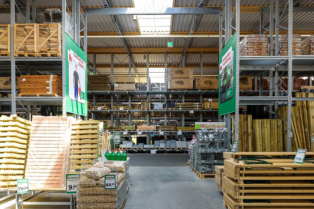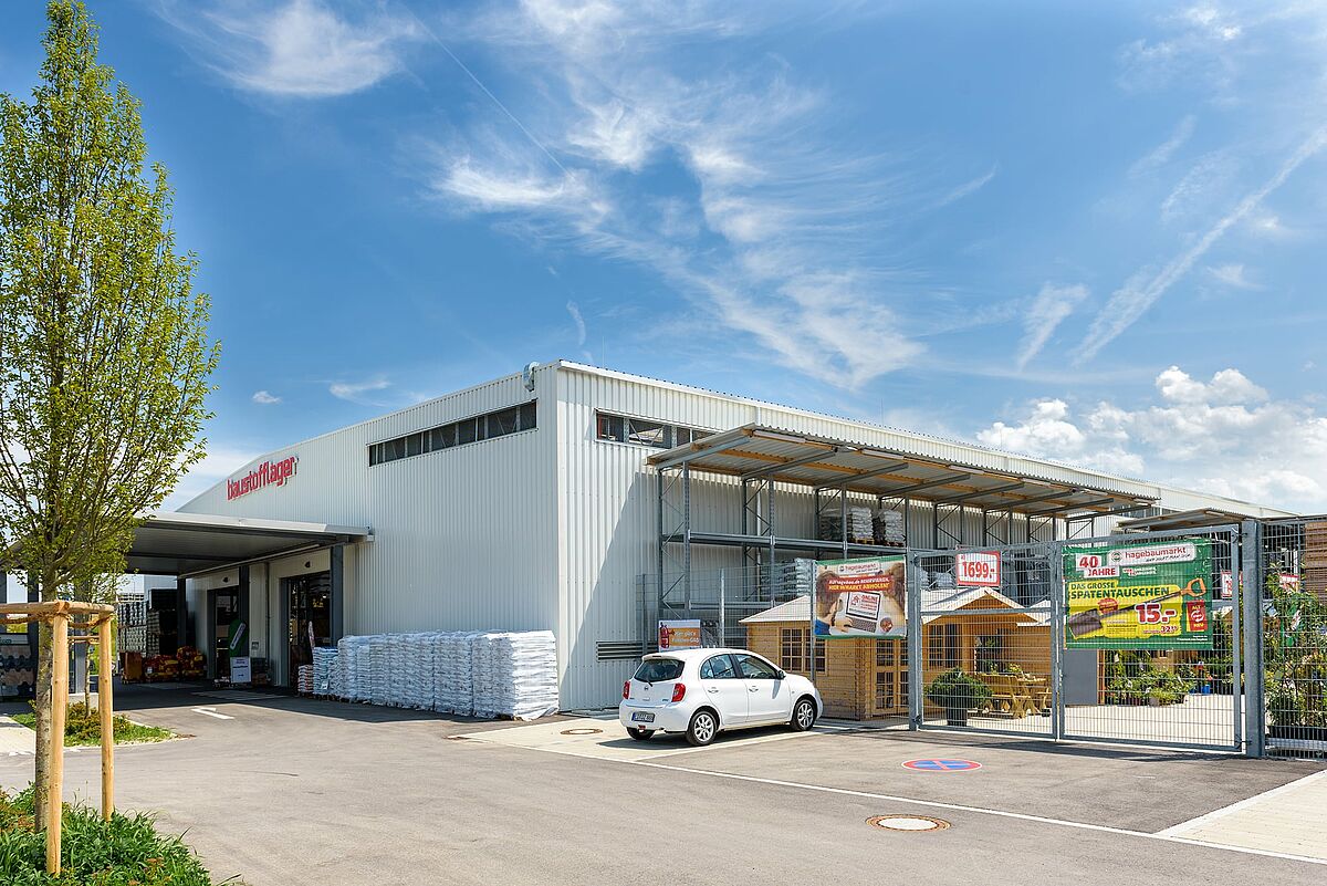 A 2018 végén megnyílt telephely hatalmas eladóterében megtalálható a Hagebau teljes kertészeti cikk és építőanyag választéka. Csak a Drive-In csarnok maga kereken 2.000 négyzetméternyi területen fekszik.