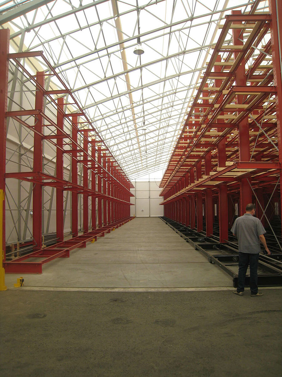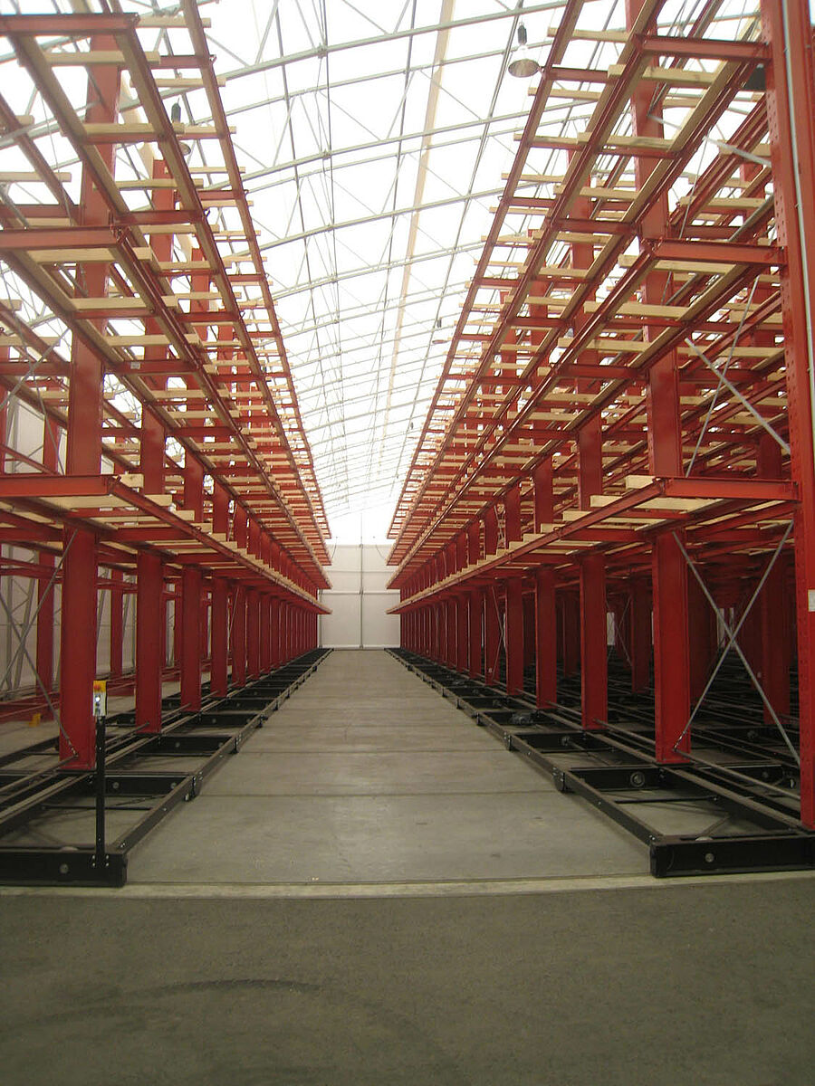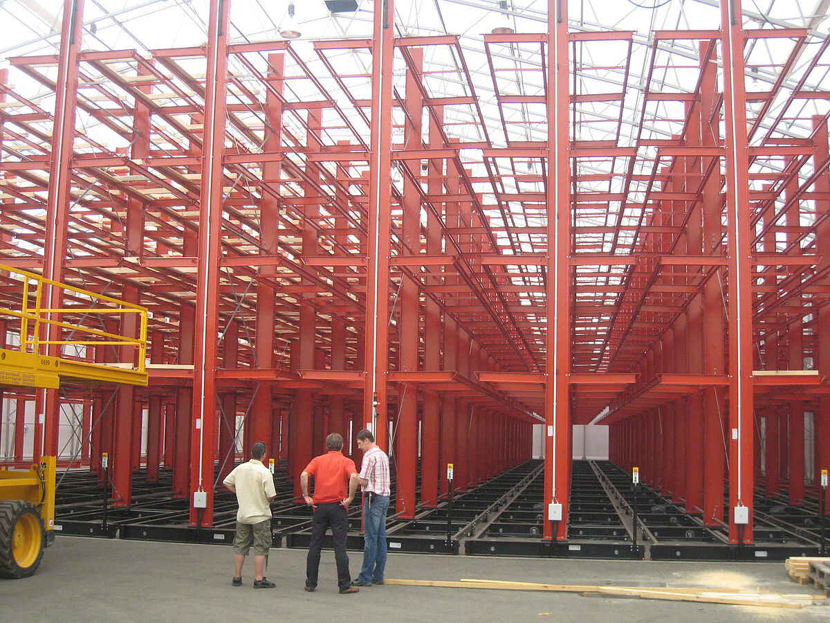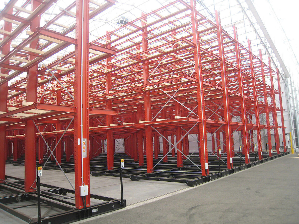 Az OHRA végezte a komplett polcrendszer felépítését. Ide tartozott a szállító kocsikhoz tartozó, a tulajdonképpeni csarnok építése előtt a szabadban lévő sínek szerelése. Az összesen 60 m hosszú, négy-öt síkkal rendelkező, akár 9,2 méter magas karos állvány közül kettő stabilan az aljzatba került lecsavarozásra. A maradék nyolcat 58 méter hosszú szállító kocsira az OHRA szerelte. A szállító kocsik elektromos hajtásúak, a targoncáról távirányítással nyithatók. Csak a kívánt járat nyílik meg - ilyen módon a meglévő felületen a raktárkapacitás csaknem megduplázódik.