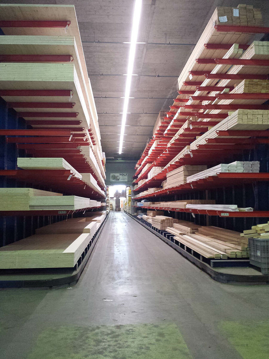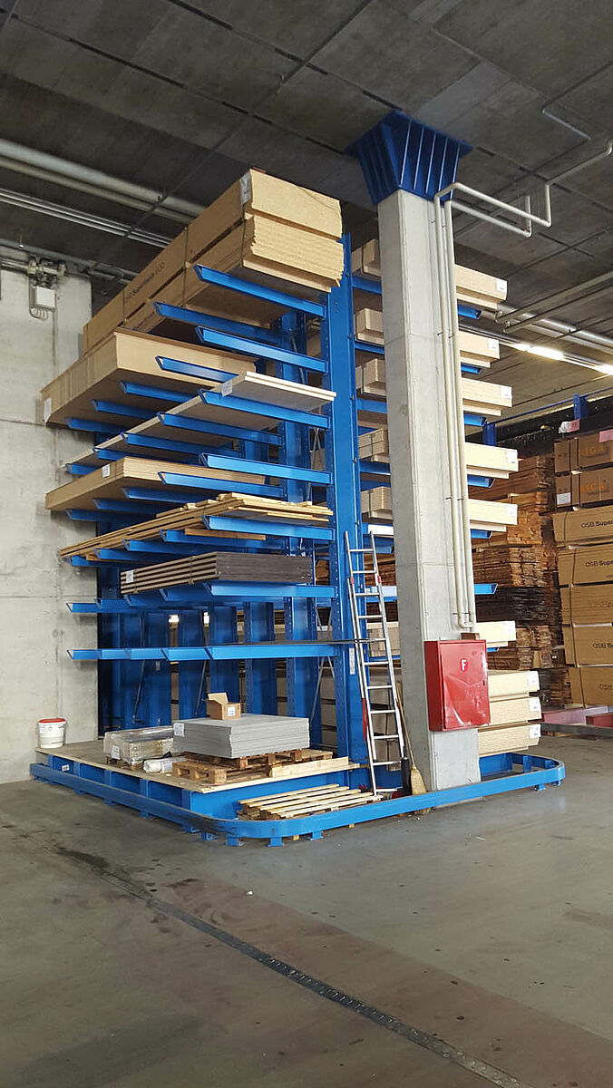 Mivel a raktárnak a legkülönbözőbb lemezek – tömör fa lemezek, OSB-, faforgács-, rétegelt fa-, MFP-lemezek és érzékeny furnérozott faforgácslemezek – számára kell helyet kínálnia, ezért egy többfunkciós állványrendszerre volt szükség. A Gfeller cég rendelkezésére álló raktárát ezért az OHRA karos állványaival bővítette: A cég, melynek székhelye a németországi Kerpen városában van, európai szinten piacvezető a karos állványrendszerek területén. Polcainak valamennyi tartóeleme tömör falú, melegen hengerelt acélból készült. A stabil szerkezet nagy raktározási magasságokat, valamint keskeny építésmódot és így magas felület-kihasználást tesz lehetővé. A Gfeller cégnél 7 méternél magasabb tartóelemek kerültek alkalmazásra, amelyekkel kilenc szinten sikerült realizálni a raktározást.
