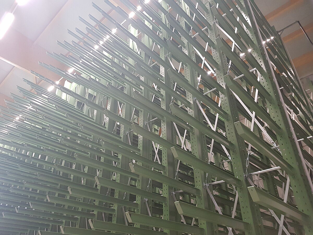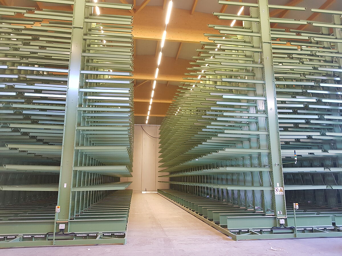 Az OHRA a raktárt mozgó alvázra szerelt négy kétoldalas karos állvánnyal szerelte fel. A raktár két végét egy-egy egyoldalas karos állvány zárja le – ezek képezik a mozgatható állványrendszer vázát. A mozgatható állványok egyenként 34 m hosszúak és kereken 11 m magasak. A megkövetelt nagy teherbírás eléréséhez a 35 állvány mindegyike 450-es IPE profilból készült. Ezek az OHRA termékpaletta legerősebb profiljai. 13 tárolási szinten 19,2 tonna terhet bírnak tartani. Az egyes mozgatható állványsorok teherbírása ezáltal 750 tonna – 720 tonna önsúly mellett.