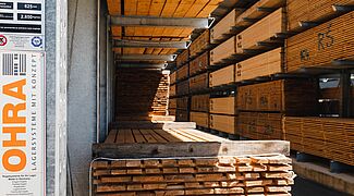 A Marles ezért úgy döntött, hogy meglévő raktárát az OHRA tíz sornyi karos állványrendszerére cseréli. A 6 080 milliméter oszlopmagasságú állványok lehetővé teszik a faanyag kötegek négyszintes tárolását, és így lényegesen nagyobb tárolási kapacitást biztosítanak ugyanazon az alapterületen. Az egyes cikkek közvetlenül elérhetők. A beépített, 1,5 méter mély tető védi a tárolt faanyagot az időjárás viszontagságaitól, míg maguk a állványok tűzihorganyzottak.