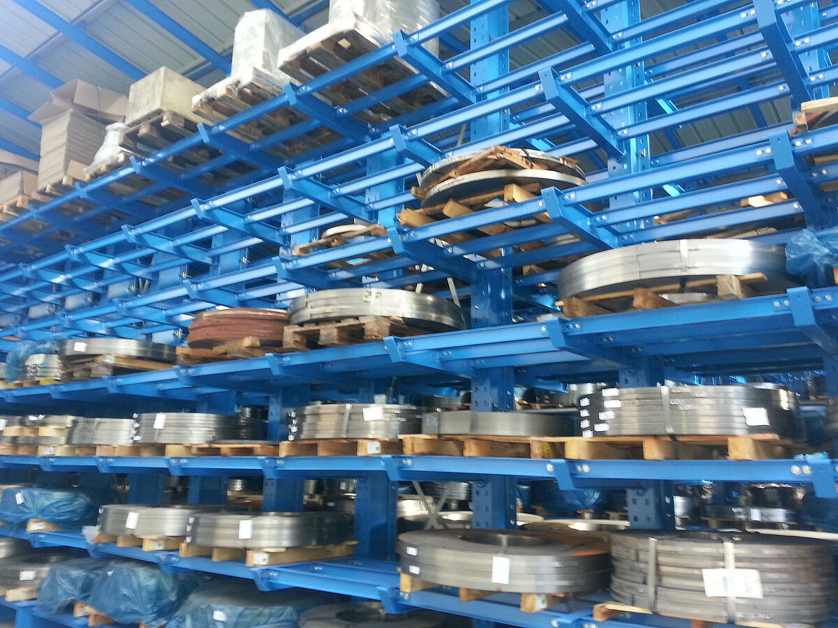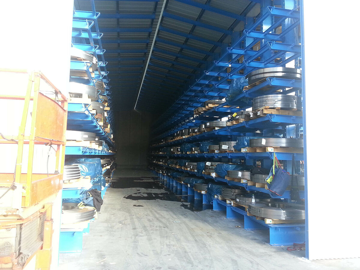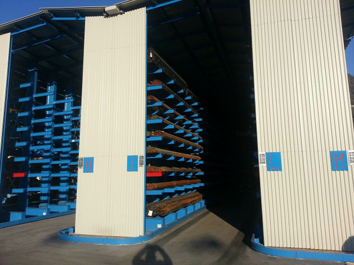 Az első három polcsorban a 6.500 milliméter hosszú és 4.000 kilogramm súlyú kötegelt rudak dupla mélységben, kilenc síkon kerülnek tárolásra. A polcok konzolai beakaszthatók, csavarokkal milliméter pontosan beállíthatók - így biztosítható a tárolt anyag egyidejű alátámasztása. Ezeket a járatokat olyan négyutas targoncák szolgálják ki, amelyeket az állványok mellett lefektetett sínek vezetnek. A többi polcsor kozolrudakkal van felszerelve és hét síkon kínál átmenő rakfelületet. Itt tárolhatók az akár 1,200 kilogramm súlyú raklapos lemezszalagok. Ezeket a járatokat villástargoncável szolgálják ki.