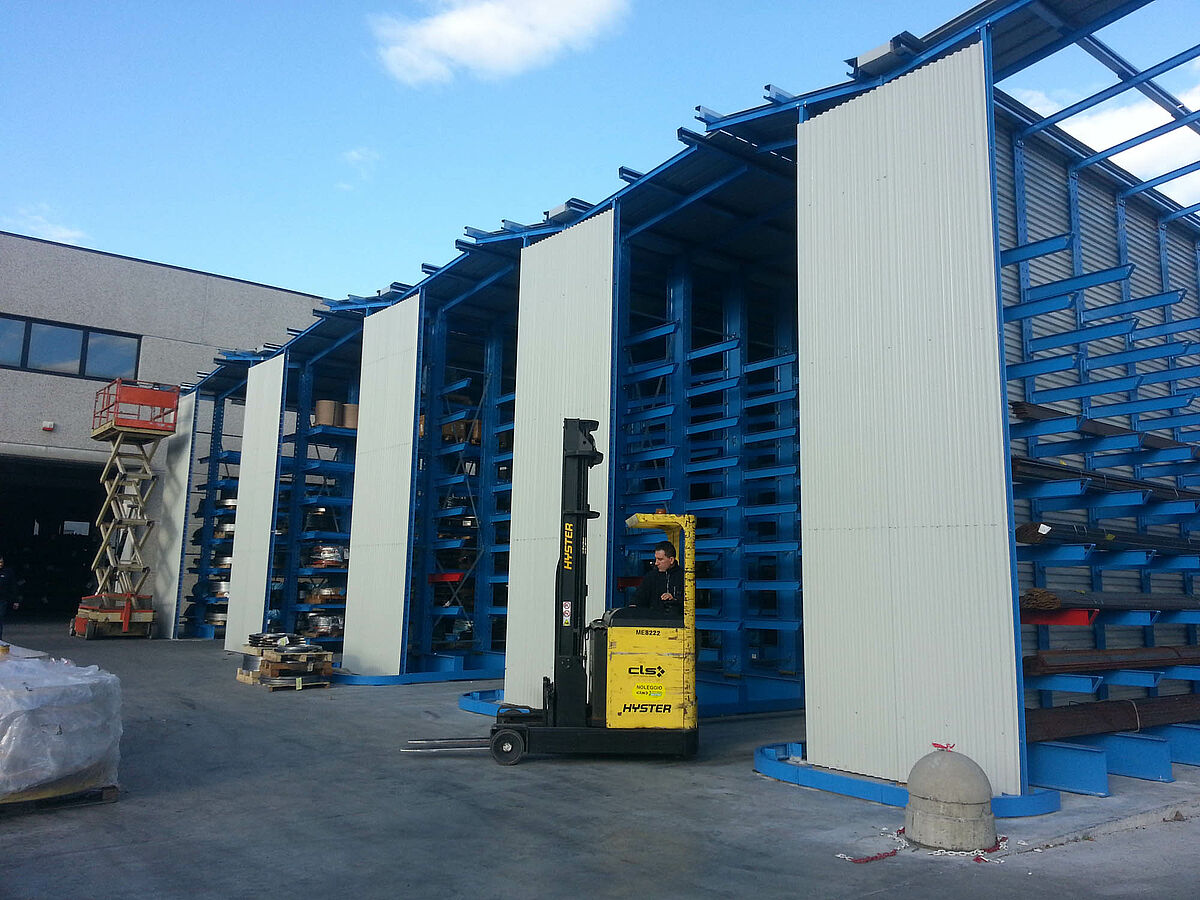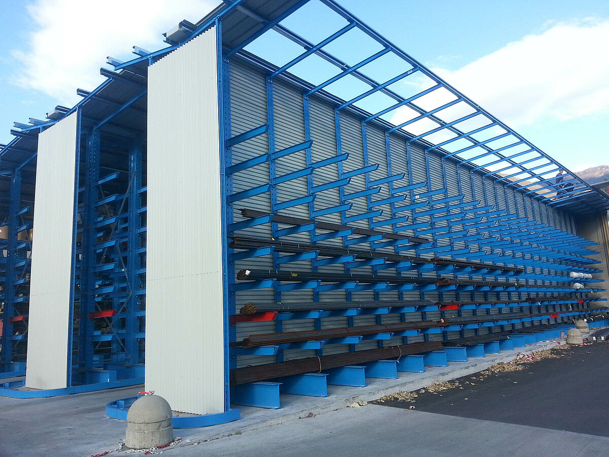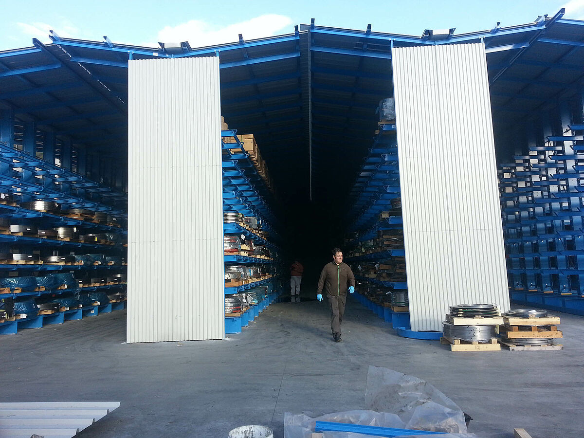 Az első három polcsorban a 6.500 milliméter hosszú és 4.000 kilogramm súlyú kötegelt rudak dupla mélységben, kilenc síkon kerülnek tárolásra. A polcok konzolai beakaszthatók, csavarokkal milliméter pontosan beállíthatók - így biztosítható a tárolt anyag egyidejű alátámasztása. Ezeket a járatokat olyan négyutas targoncák szolgálják ki, amelyeket az állványok mellett lefektetett sínek vezetnek. A többi polcsor kozolrudakkal van felszerelve és hét síkon kínál átmenő rakfelületet. Itt tárolhatók az akár 1,200 kilogramm súlyú raklapos lemezszalagok. Ezeket a járatokat villástargoncável szolgálják ki.