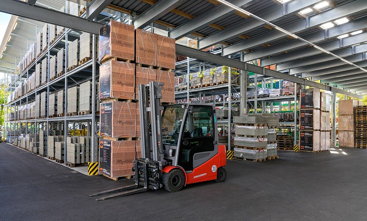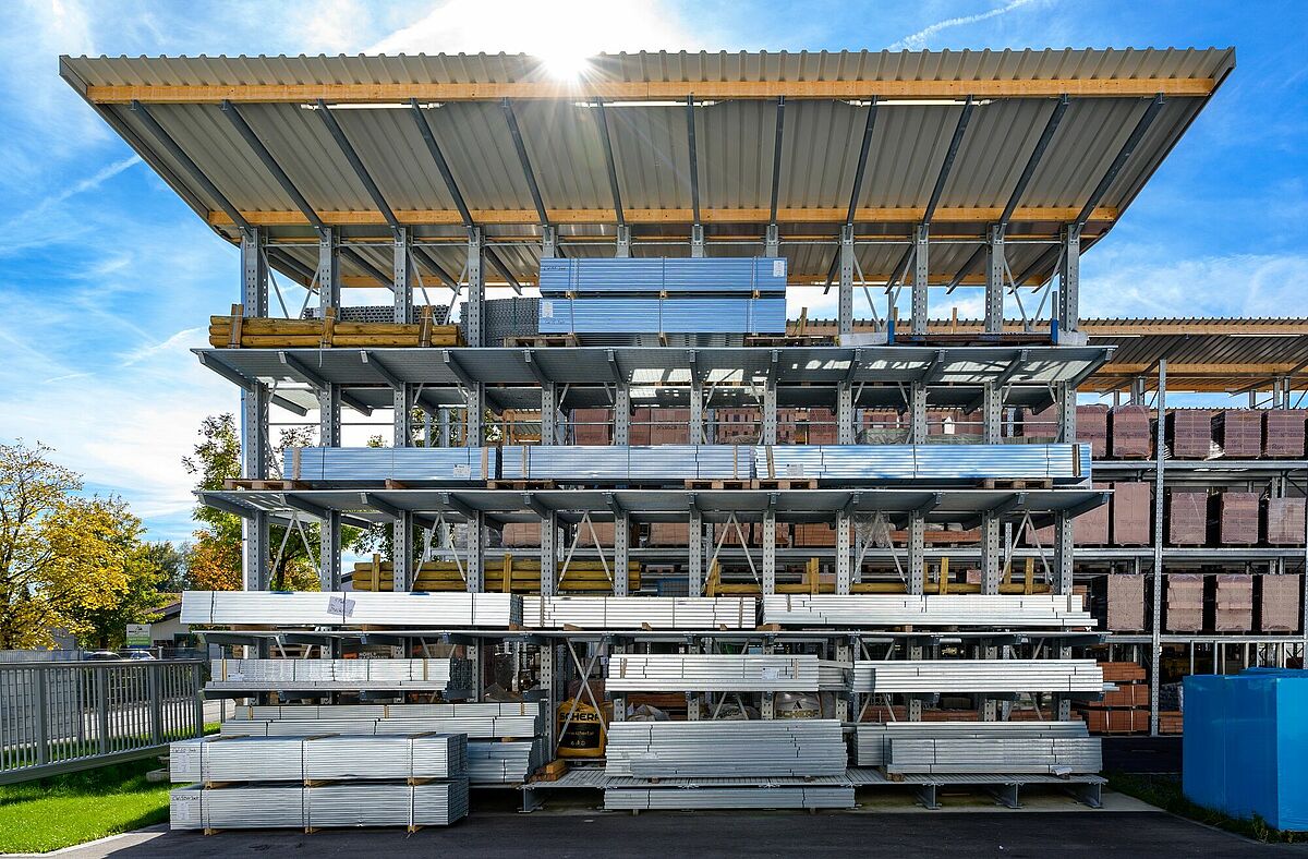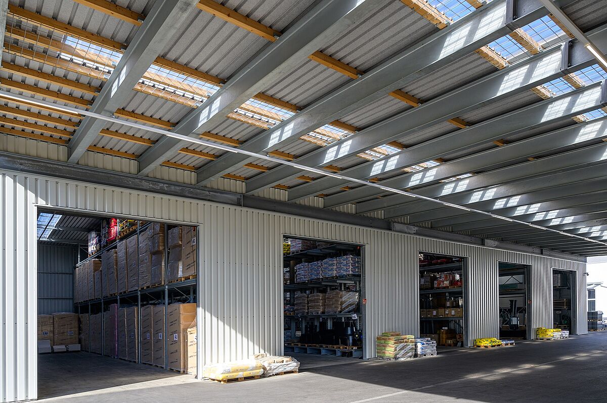 A csarnok állványai a külső tér állványaihoz hasonlóan nagy teherbírásúak: Az 1250 mm hosszú karos állványok 1,2 tonnát bírnak, a raklapos állványok teherbírása akár 4,5 tonna. Annak érdekében, hogy a Schneider Baucentrum sokoldalú termékkínálatát rugalmas módon tárolni tudják, az OHRA az állványokat rácsrostélyokkal szerelte fel – így a cementes zsáktól kezdve az EUR raklapokig minden árucikk bármely helyen tárolható az állványokon.