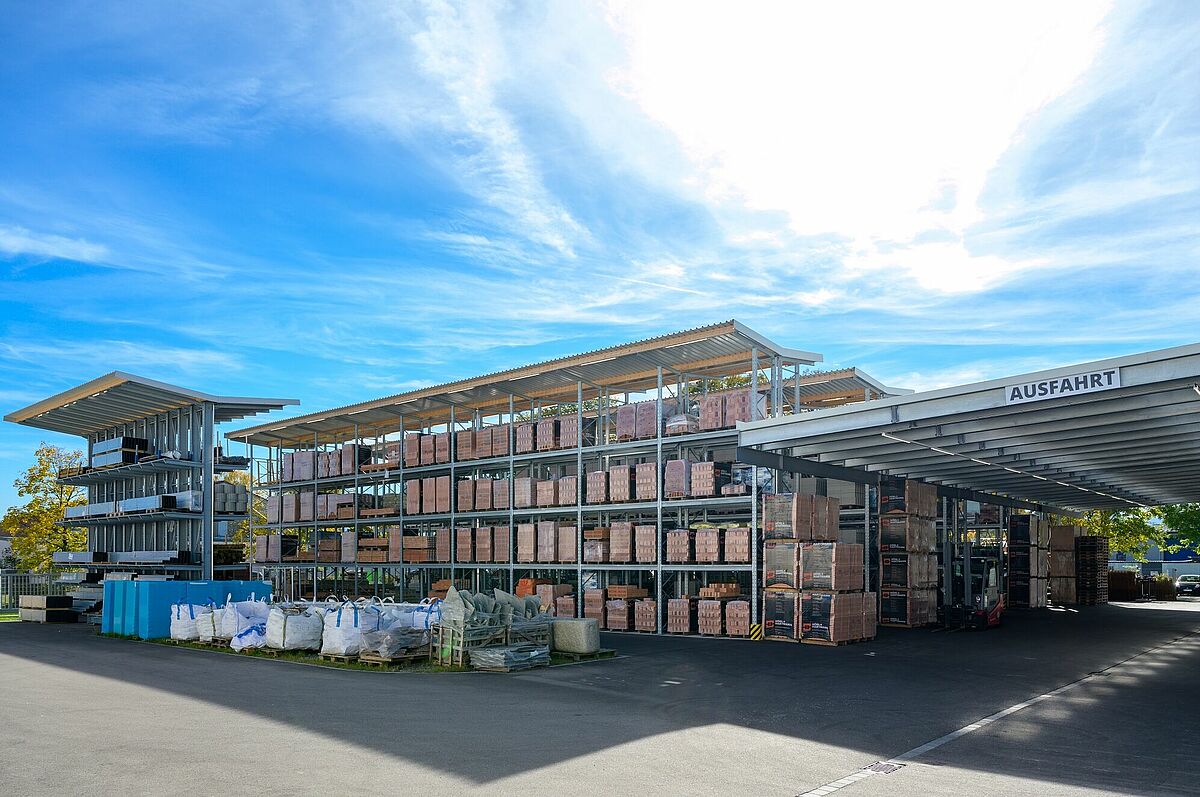 További termékek kaptak helyet öt darab, 28 méter hosszú állványsoron a kültéri raktárterületen; az állványcsarnokhoz hasonlóan itt ugyancsak karos és raklapos állványokat telepítettek. Minden állványsor egy méterre kinyúló tetővel rendelkezik. Az állványcsarnok és a külső raktár között egy közlekedősáv húzódik, ahol a termékeket az ügyfelek rendelkezésére bocsátják. Ezt a sávot egy 13 méter széles tető fedi, amely az állványcsarnokot és a külső raktárterületet köti össze.