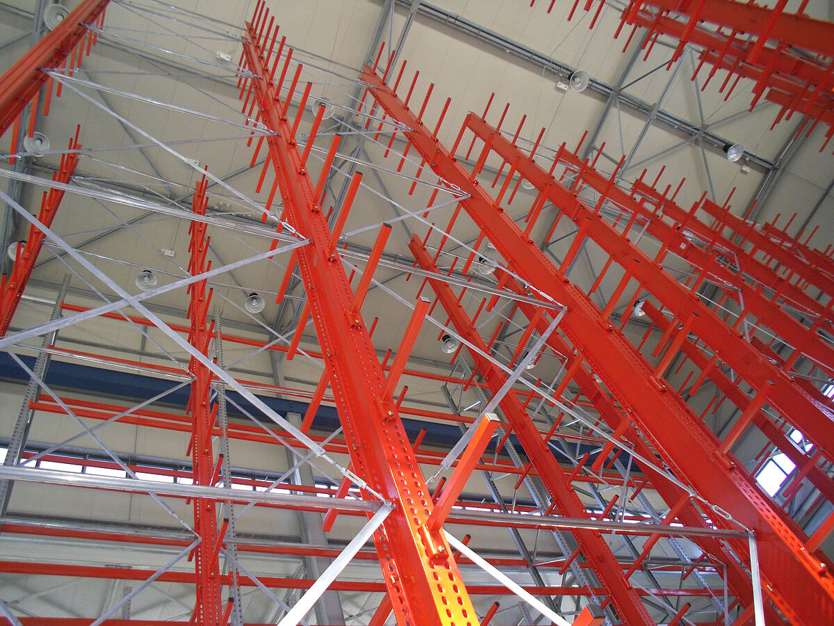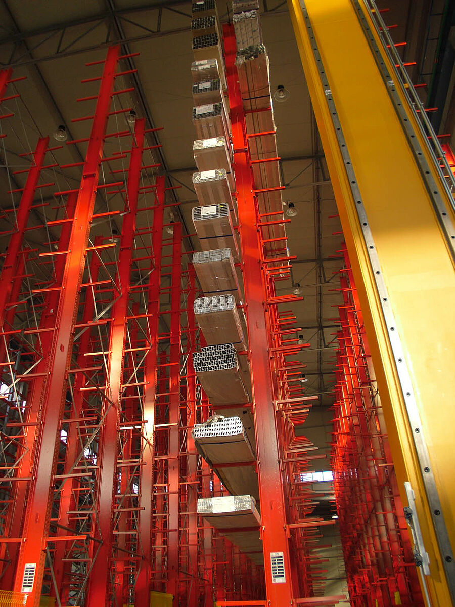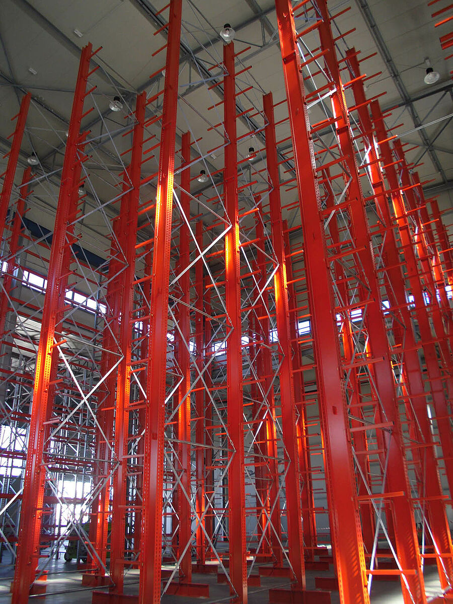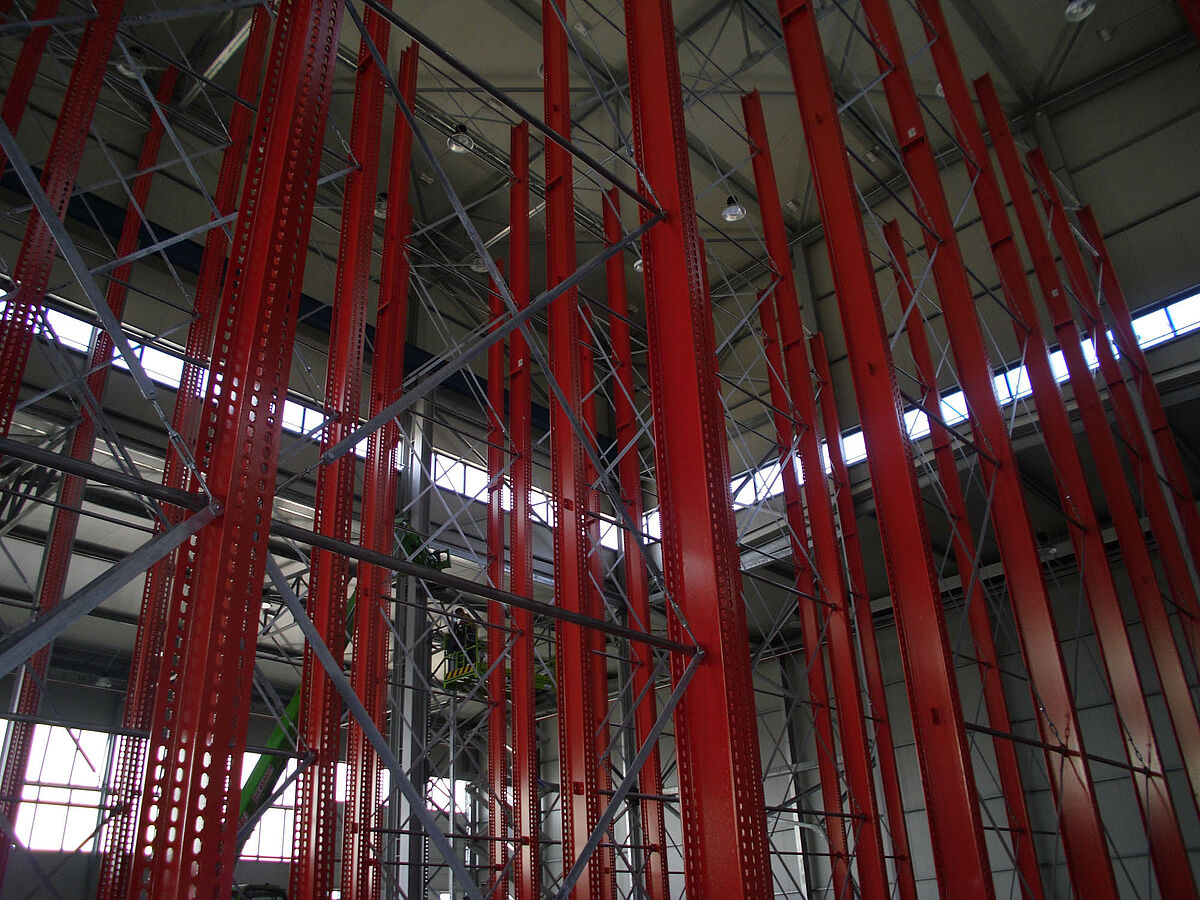 Ennek során a tervezők profitáltak az OHRA-polcok stabil, tömörfalú acélprofilokból gyártott állványaiból. Hiszen a meglévő helymagasság így volt teljesen kihasználható: A 13,7 méteres magasság ellenére az állványok szabadon állnak a térben, így a darut nem akadályozzák - az állványok tetején az 1/200-os maximálisan megengedett behajlás azonban teljes terhelés esetén sem lép fel. Ezenkívül az előzetes tervekkel - és a versenytárs ajánlatával - szemben a stabil állványoknak köszönhetően integrálható volt egy kiegészítő, egyoldalas polcsor is. Ez a raktározási teljesítmény csaknem 10 százalékos növelésének felel meg.