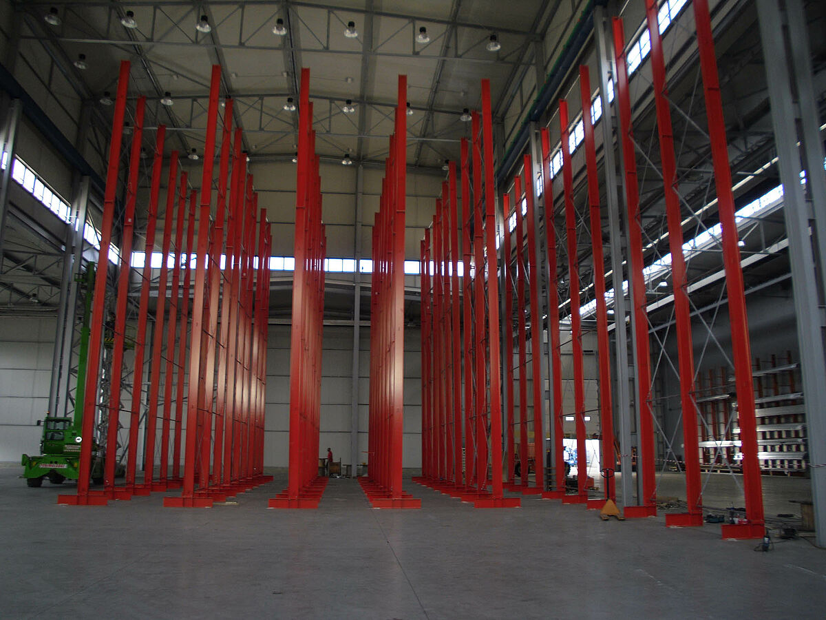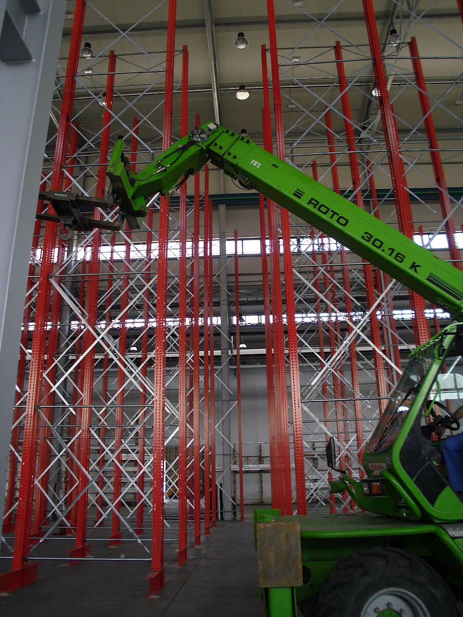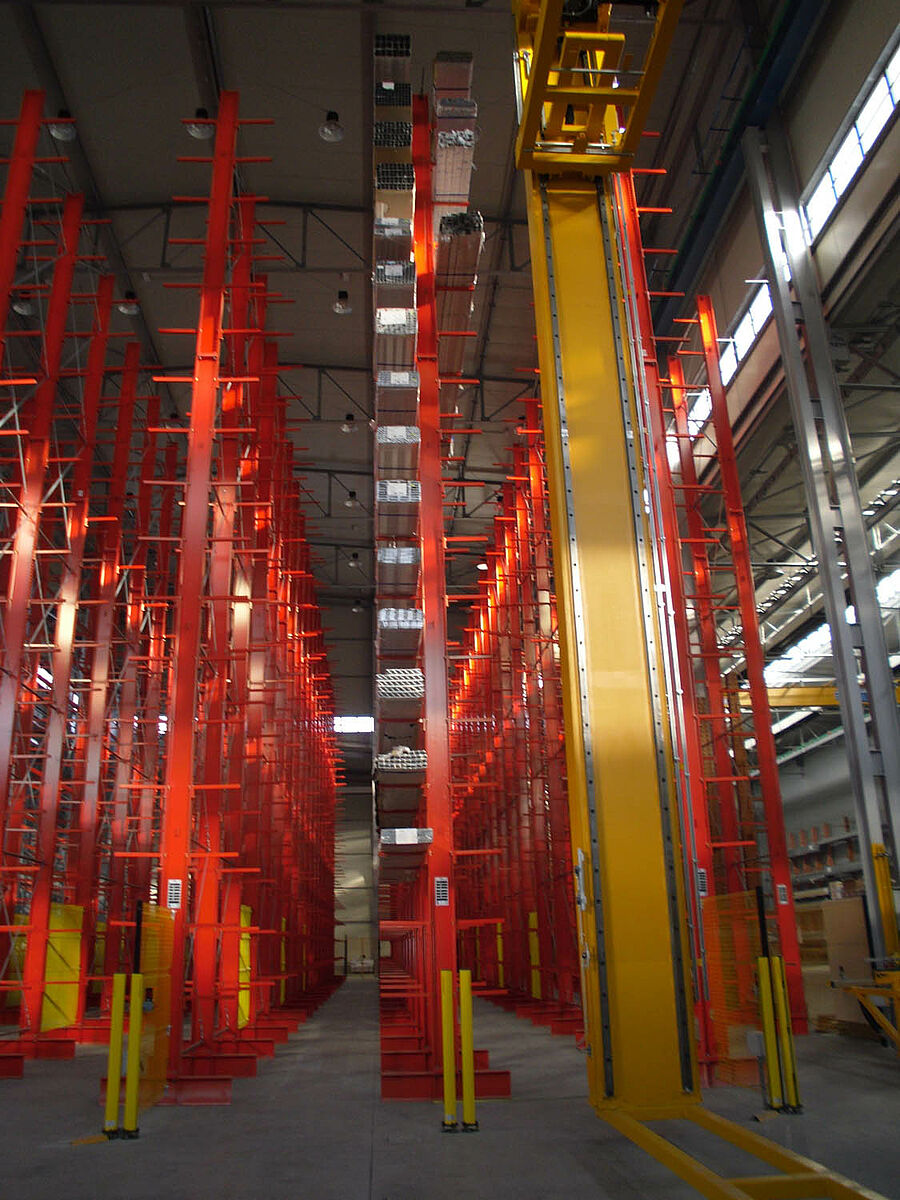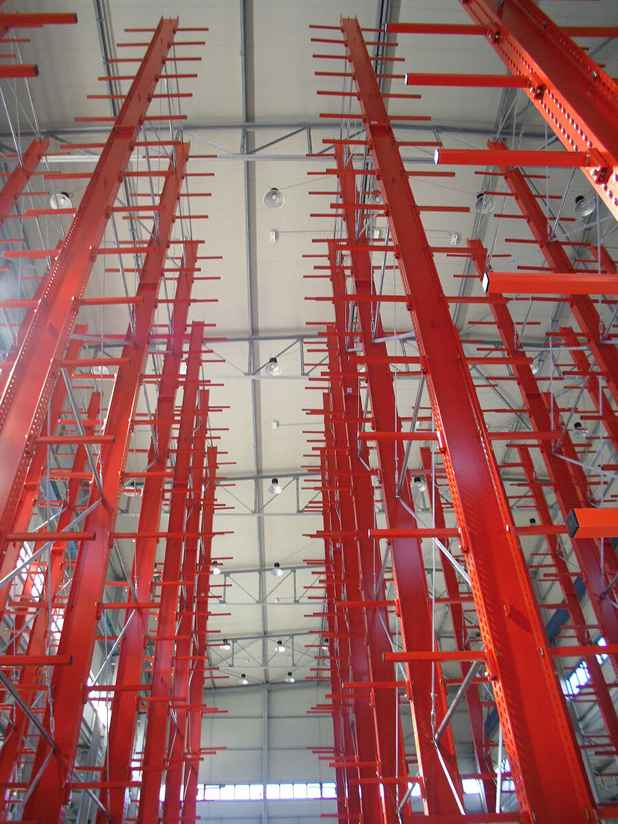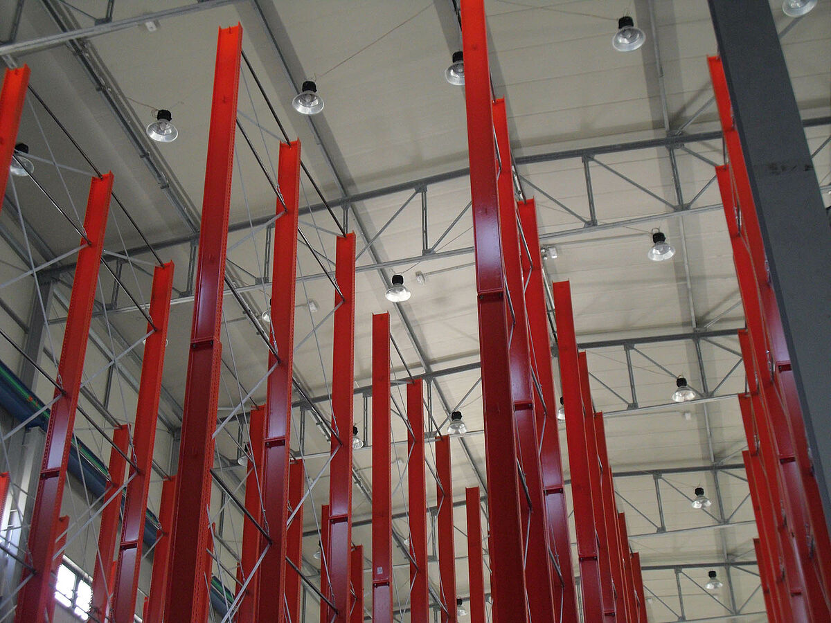 Ennek során a tervezők profitáltak az OHRA-polcok stabil, tömörfalú acélprofilokból gyártott állványaiból. Hiszen a meglévő helymagasság így volt teljesen kihasználható: A 13,7 méteres magasság ellenére az állványok szabadon állnak a térben, így a darut nem akadályozzák - az állványok tetején az 1/200-os maximálisan megengedett behajlás azonban teljes terhelés esetén sem lép fel. Ezenkívül az előzetes tervekkel - és a versenytárs ajánlatával - szemben a stabil állványoknak köszönhetően integrálható volt egy kiegészítő, egyoldalas polcsor is. Ez a raktározási teljesítmény csaknem 10 százalékos növelésének felel meg.
