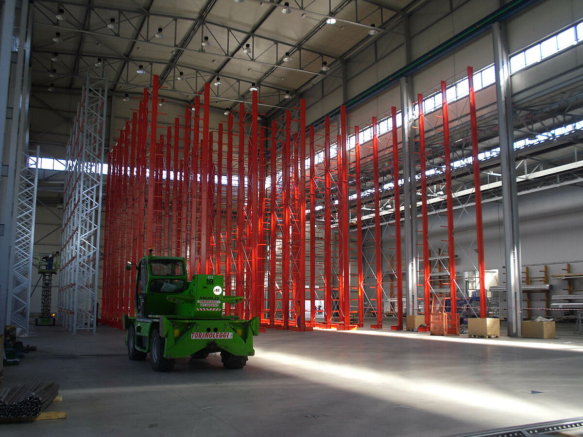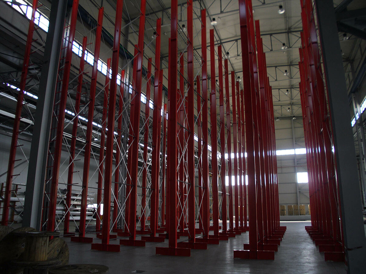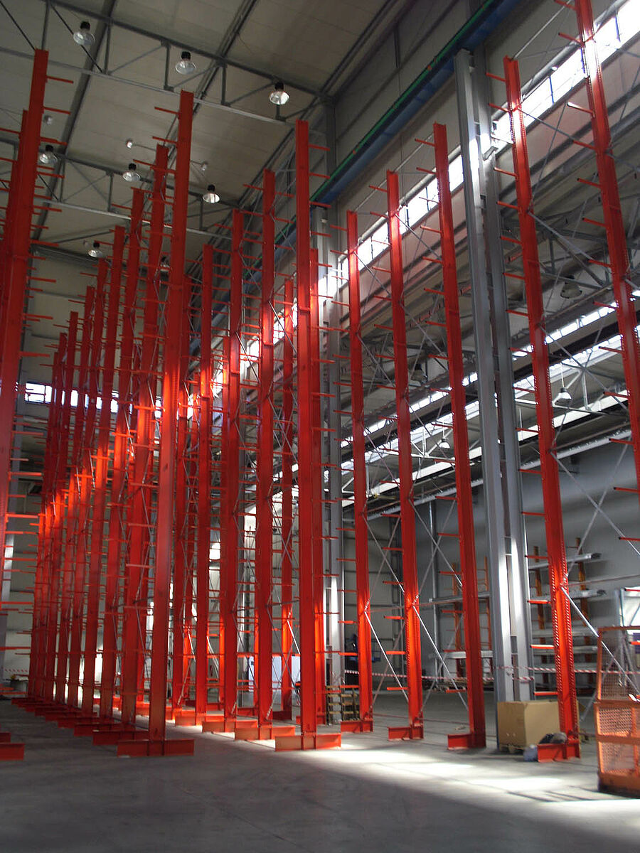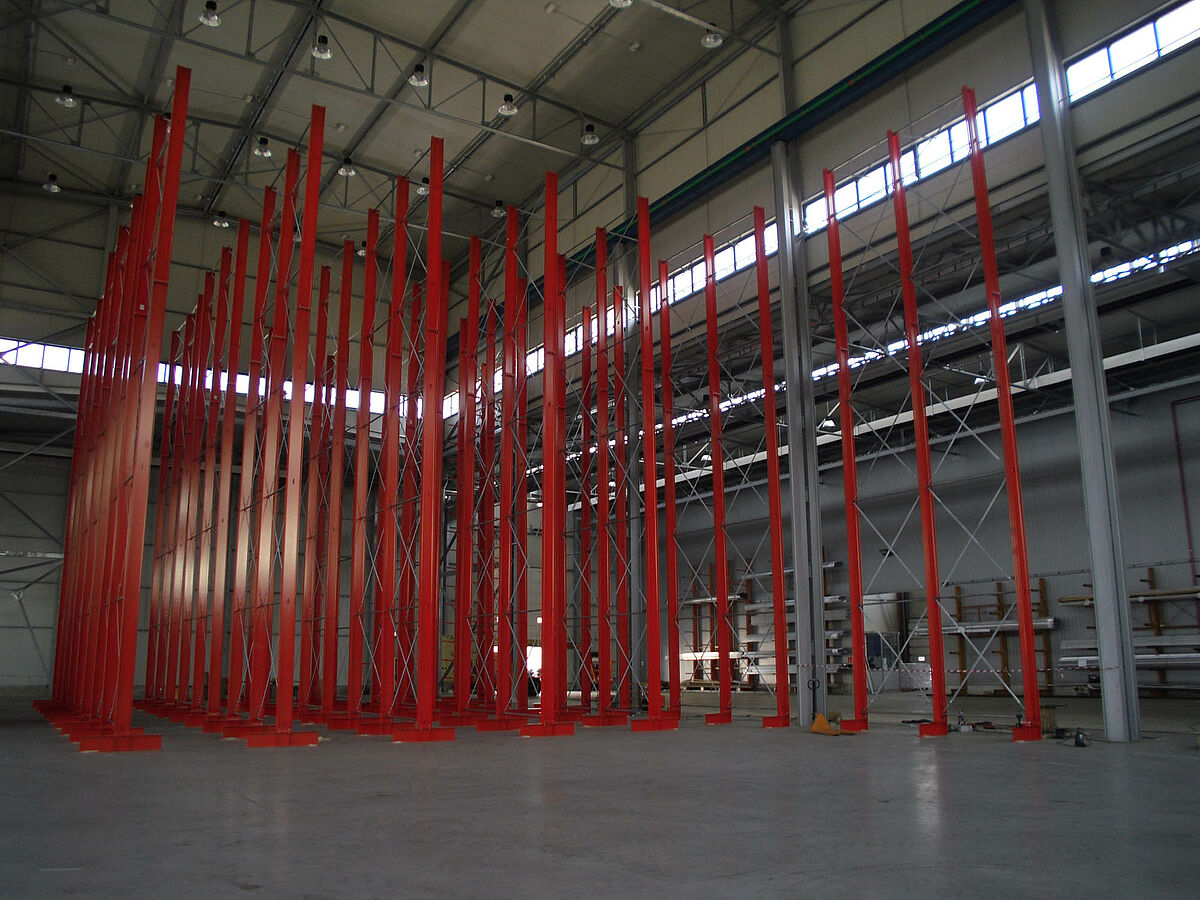 Ennek során a tervezők profitáltak az OHRA-polcok stabil, tömörfalú acélprofilokból gyártott állványaiból. Hiszen a meglévő helymagasság így volt teljesen kihasználható: A 13,7 méteres magasság ellenére az állványok szabadon állnak a térben, így a darut nem akadályozzák - az állványok tetején az 1/200-os maximálisan megengedett behajlás azonban teljes terhelés esetén sem lép fel. Ezenkívül az előzetes tervekkel - és a versenytárs ajánlatával - szemben a stabil állványoknak köszönhetően integrálható volt egy kiegészítő, egyoldalas polcsor is. Ez a raktározási teljesítmény csaknem 10 százalékos növelésének felel meg.